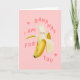Cartão de aniversário divertido com ilustração aquosa de uma banana fofa. O texto diz "Eu sou banana para você." Design cor rosa.