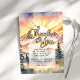 Boho e design de 1º aniversário, rústico e neutro, "Primeira viagem ao redor do sol" com uma paisagem ao estilo aquarela com montanhas, árvores de abeto e um sol ascensão.