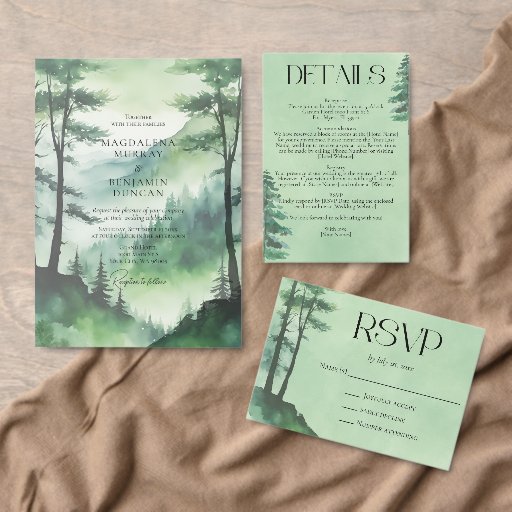 Montanhas névoas e florestas com abetos e pinheiros encantados por aquarelas, com destino rústico ou celebração de casamento ao ar livre.