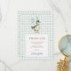 Este cartões de agradecimentos inspirado na história apresenta um adorável pato vestido com um chapéu de festa e gravata arco, segurando um balão branco. O fundo suave de gingham verde-sábio adiciona um olhar confortável e rústico.