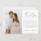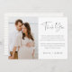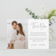 Cartões de agradecimento minimalistas modernos para o seu casamento, noivado, chá de noiva ou chá de bebê apresentam "obrigado" em letras manuscritas modernas e suaves em preto, com o seu texto personalizado e assinatura abaixo. Adicione uma foto ao lado da sua mensagem. Este design minimalista simples em preto e branco clássico é perfeito para qualquer ocasião.