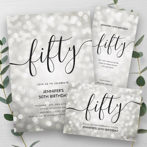 O Elegante Glam Silver Glitter Ilumina 50º convite de Script de Aniversário com Luzes Leves e script de tipografia moderno.