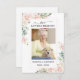 Lindos e elegantes arranjos florais cor-de-rosa decoram os cantos deste cartões de agradecimentos funerário. A foto do seu amado está na frente. O obrigado que você envia está atrás.