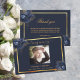 Um cartões de agradecimentos de simpatia simples e elegante com a foto. Um fundo azul escuro, uma falso estrutura dourada e florais azuis. Personalize e adicione sua nota de agradecimento.