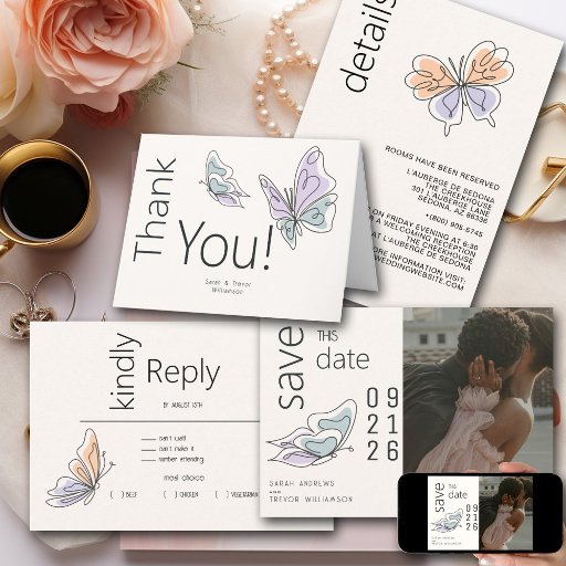 Obrigado - Contra um pano de fundo soreno de luz arenosa bege, uma borboleta branca de arte em linhagem toma palco central, suas asas adornadas com dedos lúdicos de cores violeta e mancha coral, infundindo um toque de vibração. Adicionando uma reviravolta moderna, o texto elegantemente intersetava a página perpendicularmente, criando um arranjo visual cativante que promete uma celebração do amor e da alegria. - Você pode mudar facilmente as cores da borboleta para suas especificações. design por ©WhimsicalArtwork™