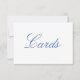 Um símbolo elegante de "Cartões" com uma bela caligrafia em azul. Opção para adicionar texto em frente e verso, caso você esteja usando um titular de mesa com as visões frontal e traseira. Opção para alterar o texto para outras necessidades. Imagem de demonstração com sinal de 5,25" x 5,25"