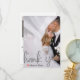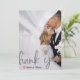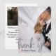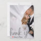Expresse sua gratidão com elegância moderna. Este design apresenta um efeito de sobreposição de véu falso romântico e posicionamento de foto personalizado para um acabamento sofisticado e minimalista. Este design utiliza um efeito digital sofisticado para simular a aparência de papel véu translúcido. Uma camada branca semi-transparente cria um fundo "nebuloso" ou "congelado" sobre a fotografia personalizada, permitindo que a imagem apareça suavemente. A tipografia apresenta uma escrita cursiva ampla e fluída em um tom cinza-prata impresso - simulando tinta metálica sem o brilho. Um pequeno coração pintado à mão em vermelho profundo fornece o único toque de cor contra a paleta monocromática de cinza e branco. Esta é uma imagem impressa plana com um efeito de {Véu Falso e Prata Impressa}. Não contém folhas de papel translúcido reais, folha metálica ou texturas