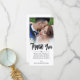 Cartão com fotos personalizado com sua própria foto de casamento. Obrigado escrito em um belo roteiro arrojado de pincel preto com um olhar caprichoso. Personalize com um bilhete para os convidados do casamento, e com os seus nomes. A borda entre a foto do casamento e o texto é amolecida com um gradiente branco.