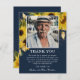 Um cartões de agradecimentos especial extra para entregar ao serviço ou enviar para amigos e familiares que mostraram seu amor e apoio durante seu tempo de luto. Apresentando um fundo azul-marinho de tendência com os girassóis amarelos do outono, no outono, e folhagem botânica verde, confete de ouro falso e uma nota de agradecimento que pode ser facilmente personalizada.