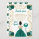 This sweet sixteen birthday thank you card invitation features an elegant gold frame, a beautiful princess with brown hair and a teal blue dress, flowers and a balloon.