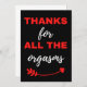 Thanks For All The Orgasms design. This is a short funny quote which is great as a Valentine's Day gift for girlfriend, boyfriend, him, her, couples, husband or wife. Also suitable as a general Love gift for Anniversary, Birthday or Christmas