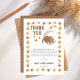 Um Chá de fraldas de tom neutro de dinossauro bonito, "Obrigado", com um precioso pequeno bebê dinossauro dormindo aninhado contra uma lua padronizada rodeada por estrelas dentro um quadro de pegadas de dinossauro.