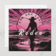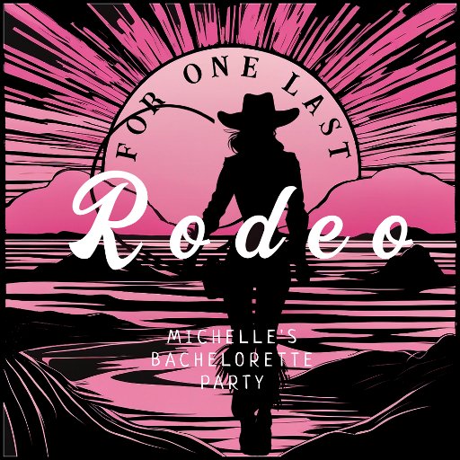 Uma Última Festa de Despedida de Solteira Rodeio, este design apresenta uma vaqueira com um visual de pôr do sol rosa e preto retrô. Ideal para qualquer festa de despedida de solteira.
