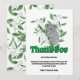 Adorável Urso Coala subindo em uma árvore de eucalipto. A tipografia é personalizável, para você atualizar sua mensagem de agradecimento. O verso do cartão de agradecimento apresenta um delicado padrão de folhas de eucalipto.