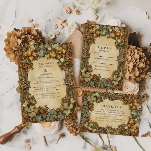 A timeless fall wedding design framed with golden ivy leaves and intricate botanical details. This vintage-inspired invitation blends antique charm with rich autumn colors — perfect for rustic, romantic, or vineyard weddings set in the golden season.