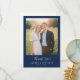 These wedding thank you cards feature a modern, minimalist design with a navy blue background that frames a warm, golden-hour photo of two individuals in a field. The layout is divided into two sections, with the top showcasing the photograph and the bottom displaying elegant script and serif typography for a heartfelt "Thank You" message. The clean lines and balanced composition create an inviting atmosphere, perfect for expressing gratitude after your special day. The sophisticated style blends classic elegance with contemporary simplicity, making these cards ideal for any wedding celebration.
