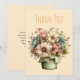 Thank you card with a cute image. Blue. pink and cream colored flowers with green leaves. Set inside a green flower pot with a green plaid cloth hanging over the side.