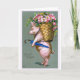 Cartão alemão do ano novo do vintage que mostra um porco que leva um guarda-chuva azul e que leva uma cesta de vime grande das flores em seu para trás. A mensagem do cartão é "Prosit Neujahr" (o feliz ano novo).