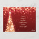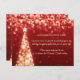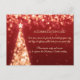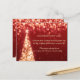 Design de Cartão de Acomodação de Natal elegante com Árvore de Natal em Dourado e Vermelho, e nomes personalizados e texto de data.