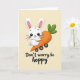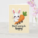 Este cartão mostra um fundo amarelo pálido com um coelho branco estilizado centrado na cena, seu rosto redondo voltado para frente com grandes olhos pretos, um nariz vermelho minúsculo e orelhas com forro rosa. O coelho abraça uma cenoura laranja superdimensionada como se fosse um amigo próximo, seus braços envoltos em um abraço apertado que é lido como afetuoso e um pouco sedutor 🐰. A cenoura é desenhada como um passeiozinho estranho com quatro rodas circulares escuras, dando à cena um sentido suave de movimento. Sombreamento suave e gradientes suaves adicionam profundidade ao redor das bochechas do coelho, das curvas da cenoura e das rodas, mantendo a aparência suave e aconchegante. Uma curta frase no estilo de trocadilho está abaixo da ilustração em letras escuras, colocada baixa e centralizada para que a imagem continue sendo o foco principal. Tons quentes de creme se misturam com laranja brilhante e um toque de verde no topo da cenoura, com pequenas