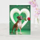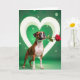 Concebido com uma sensação de retrato de estúdio, um Boxer digno está centrado contra um fundo verde profundo, segurando uma única rosa vermelha suavemente na boca 💚. Seu casaco atigrado e peito branco brilhante se destacam nitidamente, e a postura ereta do cão parece que está chegando para alguém especial. Um contorno de coração branco em camadas fica atrás do Boxer, enquadrando sua cabeça e ombros e sugerindo romance sem precisar de um único adorno extra. Os olhos do cão se voltam para cima e para a direita, como se estivesse observando uma pessoa querida entrar, enquanto o leve vislumbre dos dentes inferiores ao redor do caule adiciona um toque doce e sincero. As pétalas vermelhas da rosa e o caule verde se tornam o principal contraste de cor, chamando a atenção diretamente para o "presente" no centro do momento ☘️. A iluminação cai suavemente sobre o casaco e a rosa, adicionando um brilho suave ao pelo e uma aparência aveludada às pétalas. Não há texto na frente, deixando o contorno do coração e a rosa