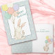 Na frente deste cartão de aniversário bonito está um pequeno coelho branco sendo levado por balões pastéis coloridos. O texto teal dentro um padrão diz "Parabéns". Dentro, o texto diz: "Vá em frente, vá embora!" Há outra imagem do coelho com os balões e flores cor-de-rosa no fundo.