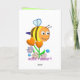 Um cartão de aniversário ilustrado com uma abelha bonitinha e flores (em forma de coração)
