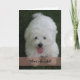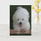 O cão tulear do de do algodão branco pede, "onde está o bolo?" neste cartão de aniversário cómico.