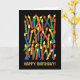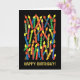 Um cartão de aniversário brilhante e colorido com velas em fundo preto, de uma colagem de papel pintada a mão por Judy Adamson. Por favor, entre em contato comigo na minha loja se você quiser que o texto do cobrir frontal seja alterado.