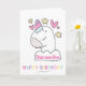 Cartão de aniversário com nome personalizado de unicórnio. Feliz Aniversário texto colorido e animal mágico fofo