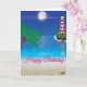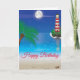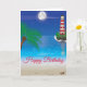 Deseje a alguém um feliz aniversário com este cartão de aniversário colorido, com o mar, a praia e um farol.