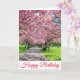 Uma bela fotografia de cerejeira florescida impressa num cartão de aniversário deixou vazio para a sua mensagem pessoal.