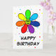 Uma flor feliz sorrindo com pétalas pontilhadas no arco-íris em fundo polkadot.