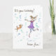 Um cartão de aniversário pintado à mão com um gato e uma dança da menina.