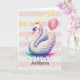 Um belo cartão de aniversário da princesa swan para o seu aniversário de 7. Você pode personalizar este cartão de cisne de aniversário com seu nome e idade. Possui cor-de-rosa, ouro e uma princesa cisne bonito com um balão cor-de-rosa na frente. A mensagem da placa dentro também pode ser personalizada se desejada. Um belo cartão de aniversário para filha, neta, etc.