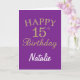Cartão de Aniversário Glitter 15 Roxo e Dourado com nome personalizado. Para mais personalização, clique no botão "Personalizar" e use nossa ferramenta de design para modificar este modelo.