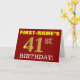 Este design de cartão de saudação de aniversário apresenta uma mensagem como "PRIMEIRO NOME DA 41rua DE ANIVERSÁRIO!", com a "41ruas" a ter uma aparência falsa e imitada de cor dourada. O nome do destinatário na frente pode ser personalizado, e o fundo frontal é vermelho colorido. Também apresenta uma mensagem de saudação de aniversário personalizável no dentro. Um cartão de aniversário como este talvez pudesse ser dado a alguém para celebrar o seu quarenta primeiro aniversário. [~Z0000184]