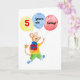 Um cartão de aniversário para uma criança de 4 anos com um rato apimentado a mão, segurando um presente e balões com as palavras '4 anos de idade hoje! Dentro texto é "Parabéns"