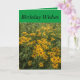 Um campo cheio de flores silvestres amarelas cobrir a frente deste cartão de aniversário.
