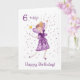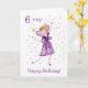 Um cartão de aniversário bonito para uma criança de 6 anos com uma fada, vestida de pó de fada roxo e espalhada, de uma pintura aquosa de Judy Adamson. dentro de vazio para sua própria mensagem.