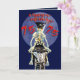 Um motoqueiro esqueleto andando de porco e fumando um cigarro. Dentro é uma fotografia de um crânio e um verso assustador. Um cartão de aniversário muito assustador.