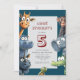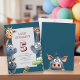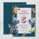 Entra numa fantástica celebração de 5 com este convite engraçado para animais safari! Esta design de revelação apresenta uma coleção de criaturas hilárias e amigáveis de safari, incluindo um macaco-prego, uma girafa-pateta, e um crocodilo-resmungão, pronto para festa. As trabalho de arte vivas e as cores ousadas certamente capturam a atenção de todos os seus convidados e definem um humor lúdico para o evento. É a maneira perfeita de convidar amigos e família para celebrar o quinto aniversário do seu filho em estilo e diversão.