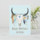 Ilustração de cor aquosa moderna e ligeiramente esmerilada das penas de Boho e do crânio decorado de miçanga/vaca com texto personalizável de "Feliz Aniversário" sobre um fundo texturizado de cor azul clara.