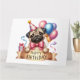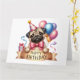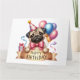 Cartão de aniversário de cachorro de Pug Bonito. Belo cachorro com balões coloridos e presentes. Arco rosa nos cães pequenos. Parabéns impressos em uma fita creme abaixo. Este cartão é vazio para você escrever sua própria mensagem. Disponível como download instantâneo para que você possa transferir para outros produtos no armazenamento.