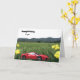 Picos de montanha com campo pastoso com flores amarelas selvagens. Um carro desportivo vermelho-quente. Deseje a alguém um aniversário fabuloso.