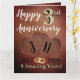 Cartão de saudação personalizado de impressão de couros feliz do 3º Aniversário de Casamento. Design de cartão de 3 anos personalizado com nomes e datas.