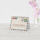 Personalize este correio aéreo vintage desgastado para o cartão de lugar de cada convidado que será colocado em seu prato. Este é preparado para um aniversário de 50 anos. Adicione uma foto antiga na frente que será seu selo junto com a idade e o nome. Personalize um de cada vez com o nome de cada convidado e adicione uma pergunta de trivia divertida abaixo para gerar conversa à mesa. Adicione a pergunta de trivia dentro. Se precisar de alguma alteração neste design (cores, etc.) basta enviar um email para paula@labellarue.com