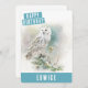 Um cartão de aniversário de aquarela, com uma coruja celebrando o inverno na frente, com "Feliz Aniversário" em uma fonte branca e boné em negrito. Personalize a frente adicionando seus nomes. A parte traseira da placa apresenta espaço para sua mensagem digitada ou manuscrita.