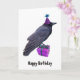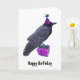 Um corvo vestindo uma festa que tocava um presente. Um cartão de aniversário elegante.