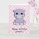 Apesar de um hipopótamo não ser o desenho mais comum em um cartão de saudação, este companheiro parece muito bonito com seus amigos olhos grandes e pretos. O fundo é um padrão roxo-rosa, que dá ao cartão de aniversário um toque feminino.